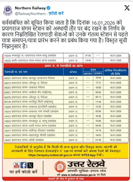 सर्वसंबंधित को सूचित किया जाता है कि दिनांक 16.01.2026 को प्रयागराज संगम स्टेशन को अस्थायी तौर पर बंद रखने के निर्णय के कारण निम्नलिखित रेलगाड़ी सेवाओं को उनके गंतव्य स्टेशन से पहले यात्रा समापन/यात्रा प्रारंभ करने का प्रबंध किया गया है। विस्तृत सूची निम्नानुसार है। pic.twitter.com/hYHwUQiK1B