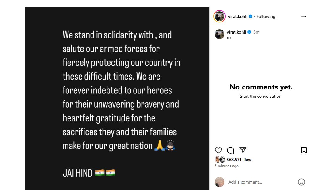 Virat Kohli posted on his Instagram, “We stand in solidarity with and salute our armed forces for fiercely protecting our country in these difficult times. We are forever indebted to our heroes for their unwavering bravery and heartfelt gratitude for the sacrifices they and their families make for our great nation.”